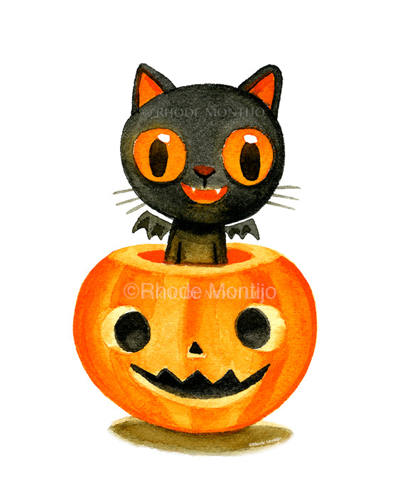 Bat Cat loves to play hide and seek in Jack-O'-Lanterns! This is a 8 x 10 inch signed print of a bat cat in a Jack-O'-Lantern that comes signed at the bottom by Rhode Montijo. Printed on Fuji Archival luster paper, this comes bagged and with a kraft back board for safe delivery. 8 x 10 inches is a common frame size, so no special framing needed IF framed!