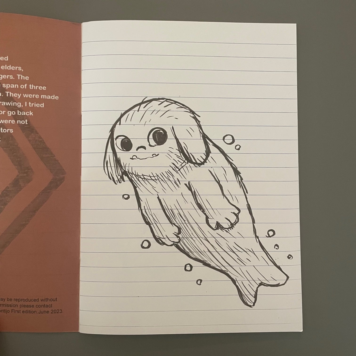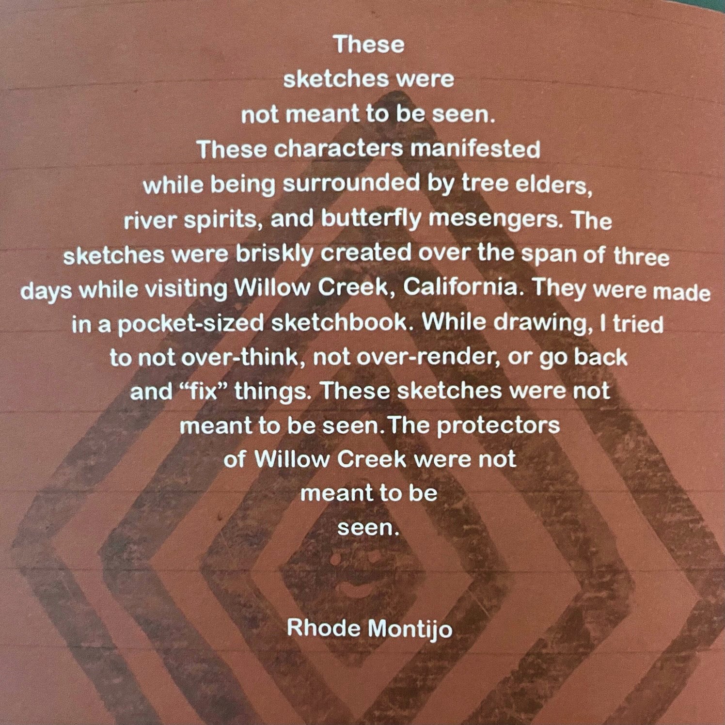 Introducing something special, a new mini-sketchbook. This is a new 24 page sketchbook from a series of personal sketches created briskly in the span of 3 days while visiting Willow Creek in California. I hadn't planned on sharing these sketches while making them so there was no second-guessing while creating. I hadn't even packed a sketchbook for our trip but was moved to draw and bought a lined notebook at the local grocery store. These were not meant to be seen. It was through a friend's encouragement that I gathered a few sketches to produce this sketchbook similar in size to the notebook they were created in. There are no Halloween sketches in this one, these are the Protectors of Willow Creek. They were not meant to be seen.
