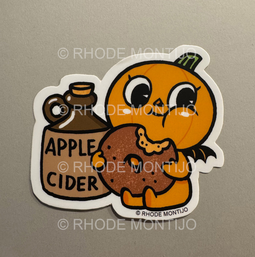 Get cozy with this adorable winged pumpkin cutie delighting in a scrumptious apple cider donut paired with a generous serving of apple cider—perfect for adding a playful autumn touch wherever you stick it! This is a 4 inch die cut sticker with a satin finish.