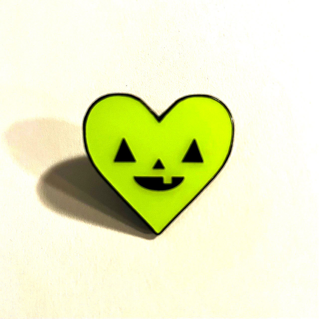 It's the classic I HEART HALLOWEEN pin but in a GLOW-IN-THE-DARK color way! It measures 1 inch long. It comes with 1 rubber clasp and Rhode Montijo embossed signature back stamp.